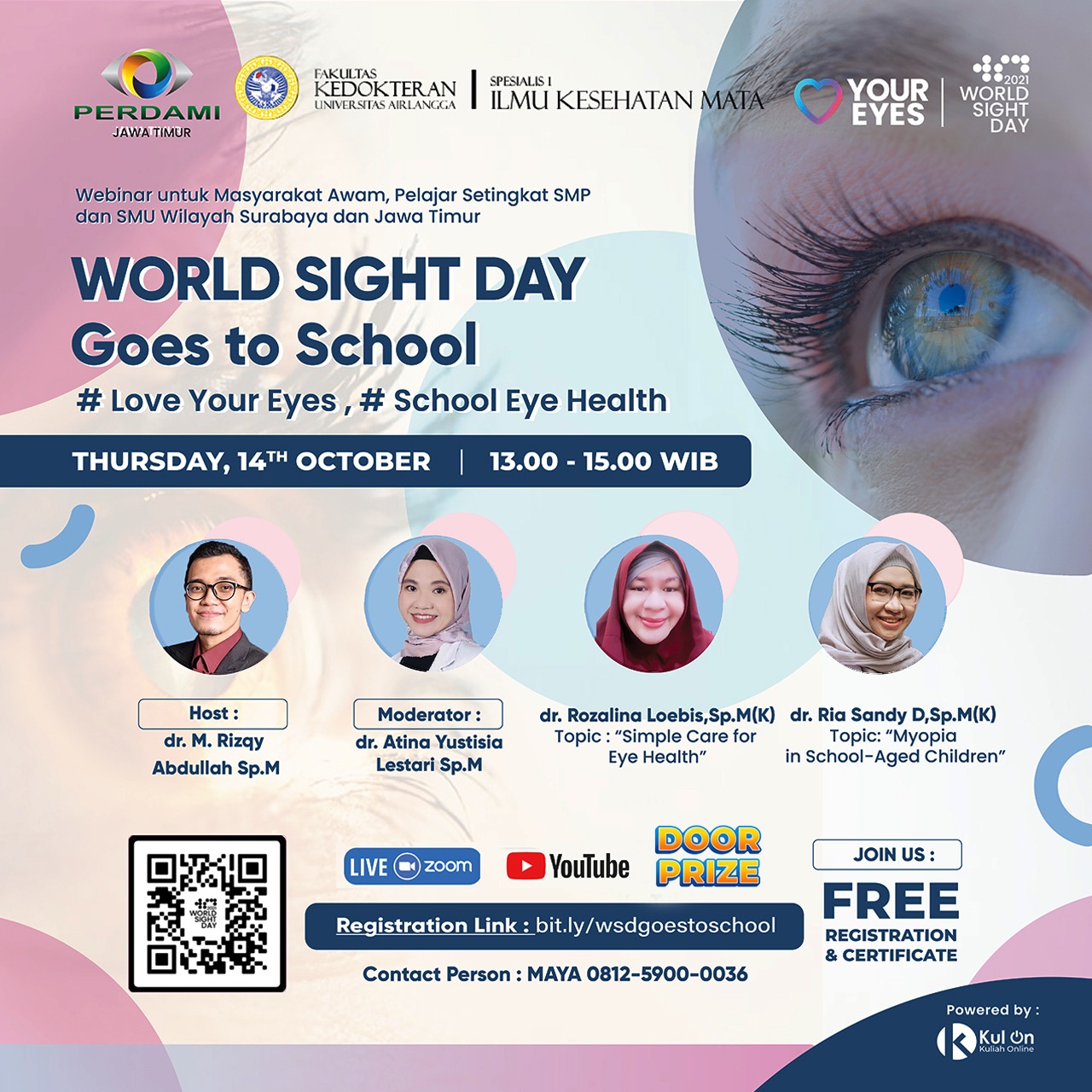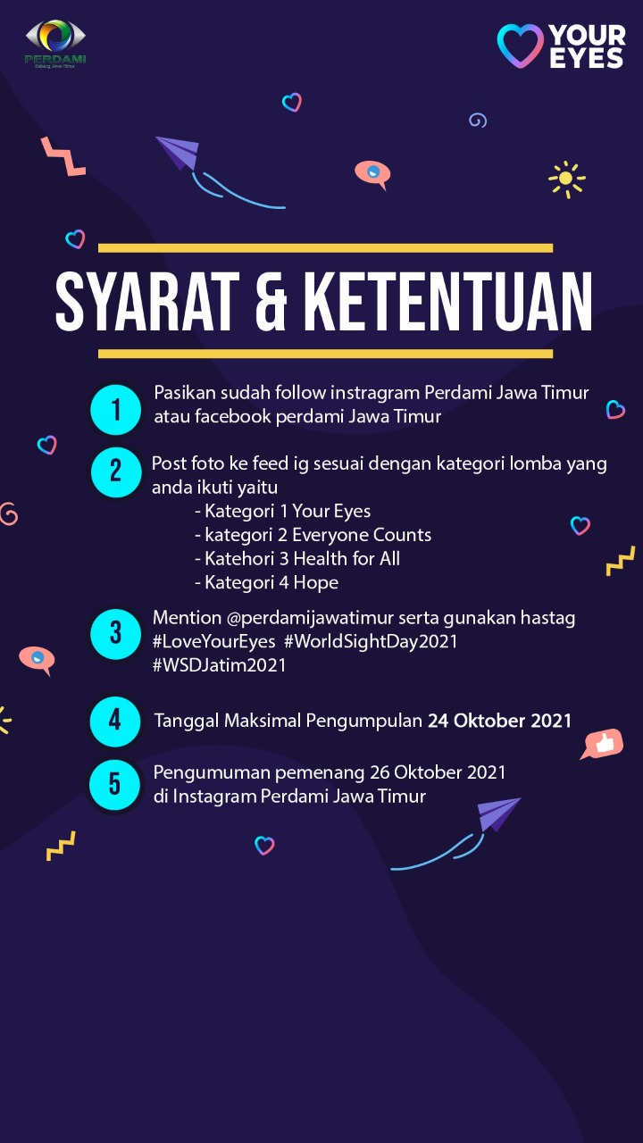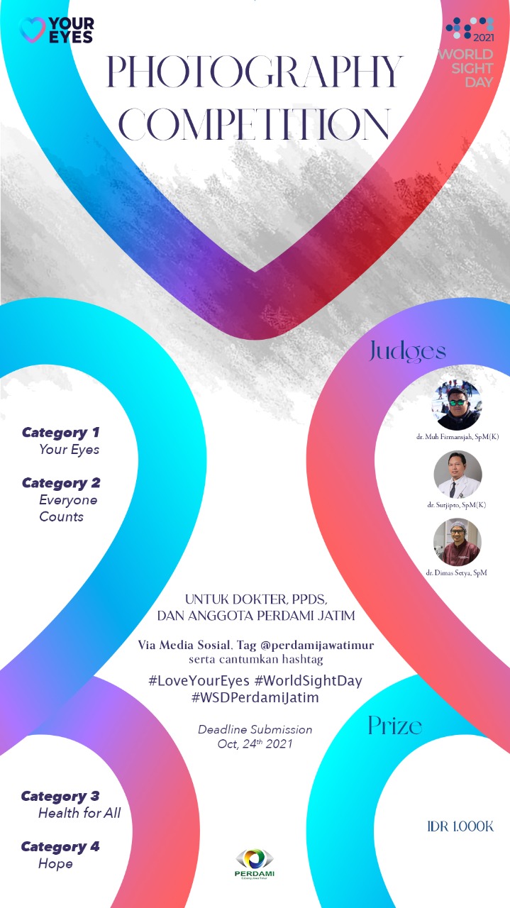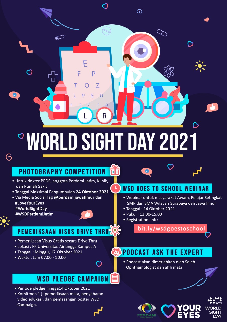 World Sight Day 2021, yang akan dilaksanakan serentak pada tanggal 14 Oktober 2021, Perdami Jawa Timur berkolaborasi dengan Departemen Ilmu Kesehatan Mata, Fakultas Kedokteran Universitas Airlangga, Dr. Soetomo General Academic Hospital dan Rumah Sakit Universitas Airlangga, Surabaya.